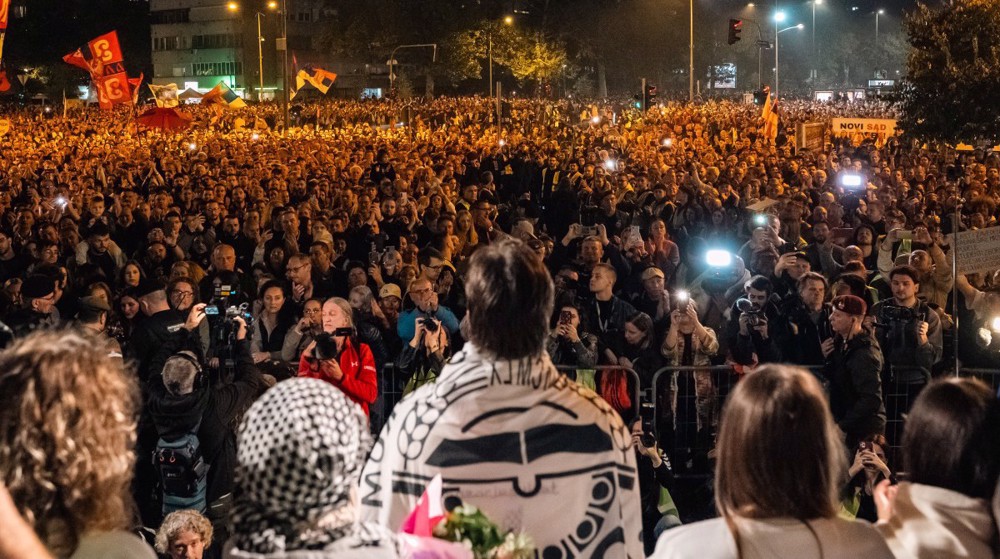 A large group of student-protestors from the southern-Serbian city of Novi Pazar are greeted by a crowd upon their arrival in Novi Sad after a 16-day march to take part in a gathering marking the first anniversary of the Novi Sad railway station tragedy, in Novi Sad, on October 31, 2025. (Photo by AFP)